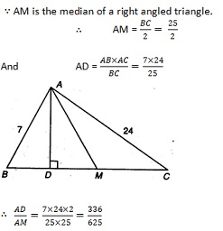 \(\triangle\)ABC is a right angled at A and AD is the altitude to BC. If AB= 7cm and AC= 24cm. Find the ratio of AD is to AM if M is the mid-point of BC: