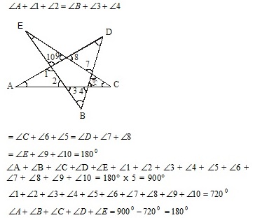 In fig., the adjoining figure \(\angle \)A + \(\angle \)B + \(\angle \)C + \(\angle \)D + \(\angle \)E = ?