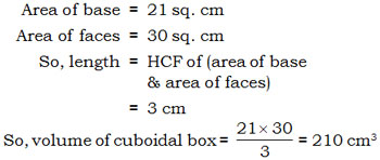 The area of the base of a cuboidal box is 21 sq. cm and the area of one of the faces is 30 sq. cm. The numerical value of each of the dimensions of the box is an integer greater than 1. Then the volume of the cuboidal box (in cu. cm) is –