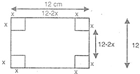 Volume of the cuboid formed = (12 - 2x) (12 - 2x) (x) cubic cm. Length of cuboid > 0