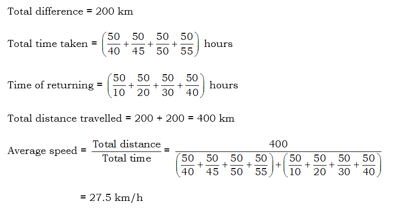 A man has to travel 200 km. In starting he travels 50 km at a speed of 40 km/h. After this every 50 km he travels 5 km/h faster than previous speed. At the time of returning first 50 km he travels at a speed of 10 km/hr. After this every 50 km he travels 10 km/h faster than the previous speed. Then find the average speed of whole journey?