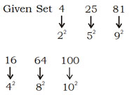 Find out a set of numbers amongst the four sets of numbers given in the alternatives which is most alike the set  given in the question. Given Set : 4, 25, 81