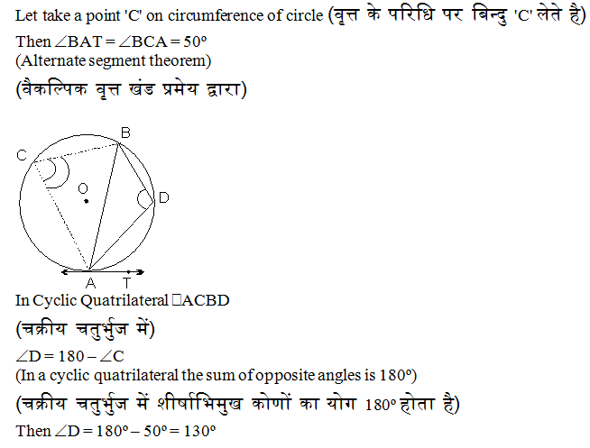 In the figure below, AB is a chord of a circle with centre O. A tangent AT is drawn at point A so that \(\angle \)BAT = 50º. Then \(\angle \)ADB = ?