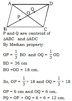 The length of diagonal BD of a parallelogram ABCD is 36 cm. P and Q are the centroids of triangle ABC and the triangle ADC respectively. What is the length (in cm) of PQ ?