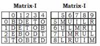 A word is represented by only one set of numbers as given in any one of the alternatives. The sets of numbers given in the alternatives are represented by two classes of alphabets as in two matrices given below. The columns and rows of Matrix I are numbered from 0 to 4 and that of Matrix II are numbered from 5 to 9. A Set from these matrices can be represented first by its row and next by its column, e.g., ‘B’ can be represented by 00, 14, etc. Similarly, you have to identify the set for the word given ‘TRUE’.