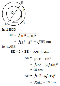 The radii of two concentric circles are 13 cm and 8 cm AB is a diameter of the bigger circle and BD is a tangent to the smaller circle touching it at D and the bigger circle at E. Point A is joined to D. The length of AD is –