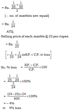 A person buys certain number of marbles at 20 per rupee and equal number at 30 per rupee. He mixes them and sells them at 25 per rupee. His gain or loss in the transaction is: