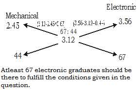 In an engineering college the average salary of all engineering graduates from mechanical trade is Rs.2.45 lakhs per annum and that of the engineering graduates from electronic trade is Rs.3.56 lacs per annum. The average salary of all mechanical and electronics graduates is Rs.3.12 lacs per annum. Find the least number of electronic graduates passing out from this institute.