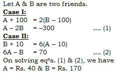 One says, "Give me a hundred, friend! I shall then become twice as rich as you". "The other replies, "If you give me ten, I shall be six times as rich as you". Tell me what are the amounts of their (respective) capitals?