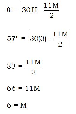 At what time between 3 and 4 are the hands at angle 57ยบ?