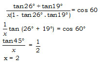 If \(\cfrac{tan\ 26^o+tan\ 19^o}{x(1-tan\ 26^o.\ tan\ 19^o)}\), then the value of x is –