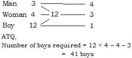 A man, a woman and a boy can complete a job in 3, 4 and 12 days respectively. How many boys must assist 1 man and 1 woman to complete the job in 14 of a day?