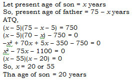 sum of their age 5 years back is 65 and their is 750 then make pair by breaking 65 whose product is 750, which is 15*50 = 750. for present age add 5 in both
