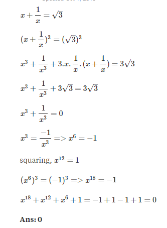 If  \(x+\frac{1}{x}=\sqrt{x}\)   , then x18 + x12 + x6 + 1 is equal to: