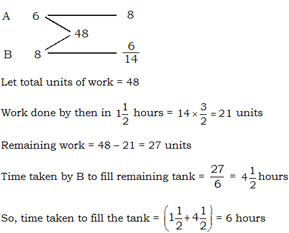 Two pipes A and B can separately fill a tank in 6 hours and 8 hours repetitively. Both the pipes are opened together. But the pipe A is turned off after 1\(\cfrac{1}{2}\) hours from the start. How much time will it take to fill the tank?