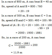 In a race of 800 metre, A can beat B by 40 metre. In a race of 500 metre, B can beat C by 5 metre. In a race 200 metre, A will beat C by: