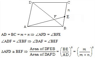 ABCD is a parallelogram. E is a point on BC such that BE:EC= m:n. If AE and DB intersect at F, then what is the ratio of the area of triangle FEB to the area of triangle AFD?