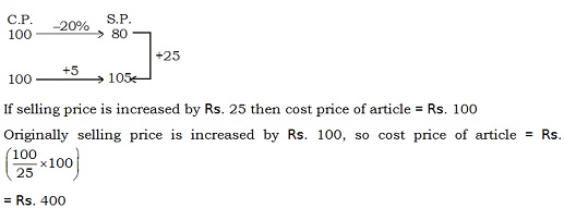 A tradesman sold an article at a loss of 20%. If the selling price has been increased by Rs. 100, there would have been a gain of 5%. The cost price of the article is –
