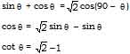 \(sin\theta+cos\theta= \sqrt[]{2} cos\theta(90-\theta)\), then \(cot\theta\) is –