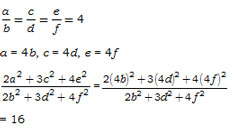 If  \(\cfrac{a}{b} = \cfrac{c}{d} = \cfrac{e}{f}\) = 4 then \(\cfrac{2a^2 + 3c^2 + 4e^2}{2b^2 + 3d^2 + 4f^2}\) = ?