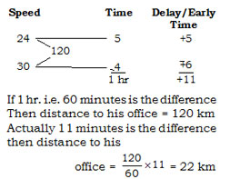 Shri X goes to his office by scooter at a speed of 30 km/hr and reaches 6 minutes earlier. If he goes at a speed of 24 km/hr, he reaches 5 minutes late. The distance to his office is  –