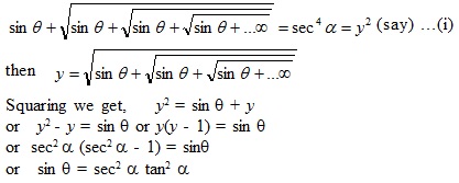 If \(sin\ \theta +\sqrt[]{sin\ \theta +\sqrt[]{sin\ \theta +\sqrt[]{sin\ \theta +.....\infty}}}=sec^4\ \alpha\) then  sin \(\theta\) is equal to: