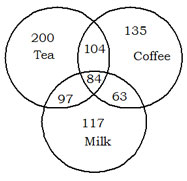 The below diagram shows the survey on a sample of 800 people in a department about their liking of Coffee, Tea and Milk. How many people like Milk and Tea both but not