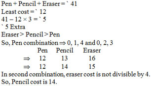 Anil buys a pen, pencil and an eraser for Rs.41. If the least cost of any of the three items is Rs.12 and it is known that a pen costs less than a pencil and an eraser costs more than a pencil, if the eraser’s cost is not divisible by 4, the cost of pencil could be —