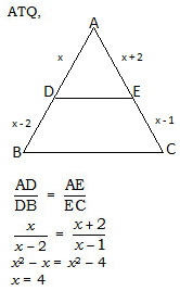 In triangle ABC, D and E are points on sides AB and AC such that DE || BC. If AD = x DB = x – 2 AE = x + 2 and EC = x – 1, then the value of x is–