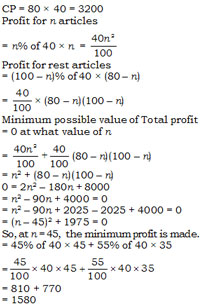 A merchant buys 80 articles, each at Rs.40. He sells x of them at a profit of x% and the remaining at a profit of (100 – x)%. What is the minimum profit the merchant could have made on this trade?