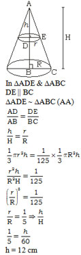 The height of the cone is 60 cm. A small cone is cut-off at the top by a plane parallel to the base and its volume is \(\cfrac{1}{125}\) th volume of original cone. What is the height of the smaller cone?