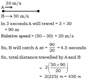 A starts from a point at a speed of 30 metre/second. After 3 seconds, B starts chasing  A  from the same point with a speed of 50 metres/second. What will be the total distance (in metres) travelled by A and B before A is caught by B ?