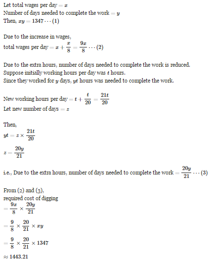 The cost of digging a pit was \(\unicode{x20B9} \)1347. How much it would have cost approx if he wages of work men per day had been increased by \(\cfrac{1}{8}\)th of the former wages and length of working day be increased by \(\cfrac{1}{20}\)th of the former period?