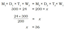 This Question solved by the time and work concept, Here M= number of men, D= no. of days, T= Time and W= work. In given question time and work not given so we ignore it,