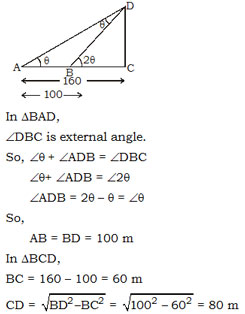 A tower standing on a horizontal place subtends a certain angle at a point 160 m away from the foot of the tower. On moving 100 m towards it, the tower is found to subtend an angle twice as before. The height of the tower is —