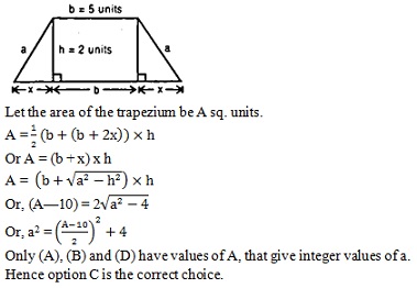 In an isosceles trapezium, the distance between the parallel sides is 2 units and the shorter of the parallel sides has a length of 5 units. If the length of the equal sides of the trapezium is an integer, then which of the following can’t be the area of the trapezium (in square units)?