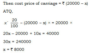 A person bought a horse and a carriage for Rs. 20000. Later, he sold the horse at 20% profit and the carriage of 10% loss. Thus, he gained 2% in the whole transaction. The cost price of the horse was –