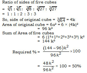 A solid metallic cube is melted to form five solid cubes whose volumes are in the ratio of 1 : 1 : 8 : 27 : 27. The percentage by which the sum of the surface areas of these five cubes exceeds the surface area of the original cube is nearest to –