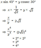 If x sin 45º = y cosec 30º, then find the value of \(\cfrac{x^4}{y^4}\).