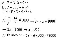 The ratio of the incomes of A and B as well as of B and C is 3 : 2. If one third of A’s income exceeds one-fourth of C’s income by1000, what is B’s income in \(\unicode{x20B9} \) ?
