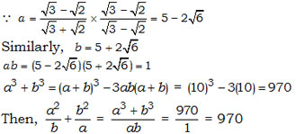 If \(a=\cfrac{\sqrt{3}-\sqrt{2}}{\sqrt{3}+\sqrt{2}}\)   and \(b=\cfrac{\sqrt{3}+\sqrt{2}}{\sqrt{3}-\sqrt{2}}\)  , then \(\cfrac{a^2}{b}+\cfrac{b^2}{a}\)  = ?