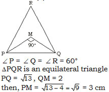 In ∆PQR, ∠P = ∠Q = 60°, PR =  \(\sqrt{13}\) cm. The lines PM and QM intersect at M with ∠M = 90°. If MQ = 2 cm, then the length of PM is–