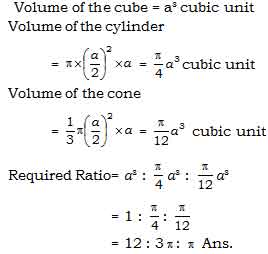 vol of cube: vol of cyl: vol of cone= a^3: pie*(a/2)^2*a: 1/3* pie*(a/2)^2*a= 12: 3 pie: pie