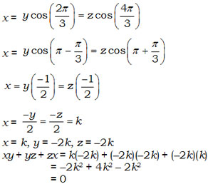 If x = y cos  2π3    = z cos 4π3   , then what is xy + yz + zx equal to?
