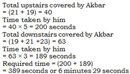 Four wives of Akbar lived in different floor of four storey building. The number of stairs of floor were 23, 21, 19 and 17 respectively and Akbar took 5 seconds per upstairs and 3 seconds per downstairs. His third wife lived on 3rd floor and he wanted to meet her. If he was on the first floor, then find the time taken by him to come ground after meeting her?