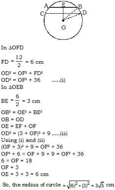AB and CD are two parallel chords of a circle with centre O such that AB = 6 cm and CD = 12 cm. The chords are on the same side of the centre and the distance between them is 3 cm. Then the radius of circle is –