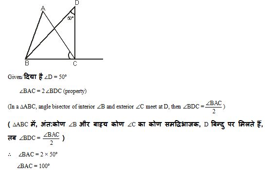 ABC is a triangle. The bisectors of the internal angle B and external angel ∠C intersect at ∠D. IF ∠BDC = 50º, then ∠A is?