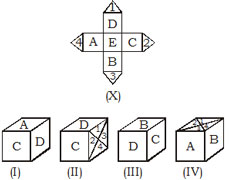 By considering E as a base, fold all four side's (square+triangle)ular figure vertically, now we get an open box, now fold each triangle to to make a square which is oppsite to E. We get the figure II after folding.