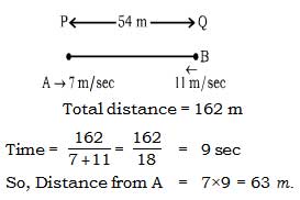 A and B start at the same time from two ends P and Q, at speeds of 7 m/sec. and 11 m/sec. towards each other, PQ being  54 m. After reaching the opposite ends, they retrace their path and start moving towards  each other. Find the total distance travelled by A when he meets B for the second time  –