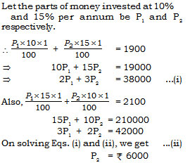 A money-lender, lends a part of his money at 10% per annum and the rest at 15% per annum. His annual income is  Rs.1900. However, if he had interchanged rate of interest on the two sums, he would have earn Rs.200 more. The amount lent at 15% was -
